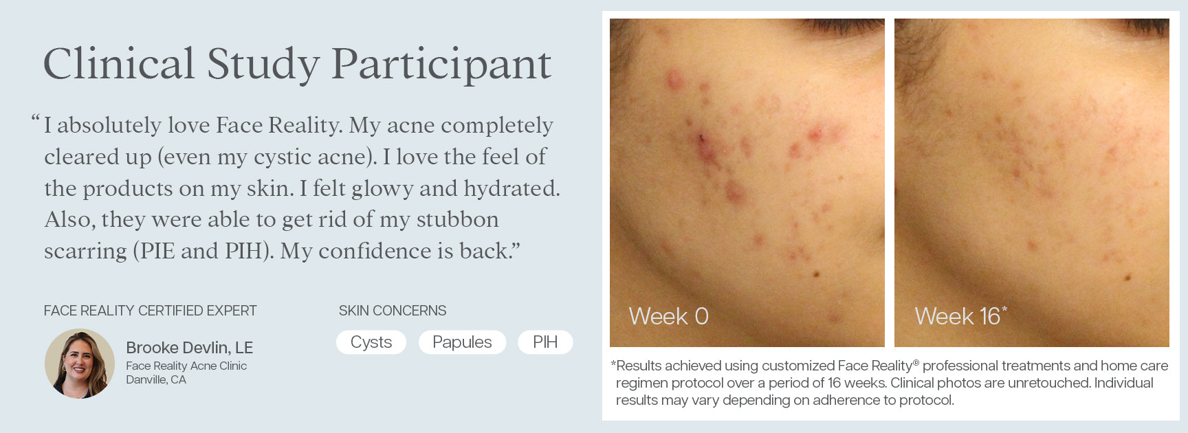 *Based on a multi-center, 16-week study of 60 participants using a protocol of Face Reality professional treatments, OTC acne and cosmetic products. Data on file.
