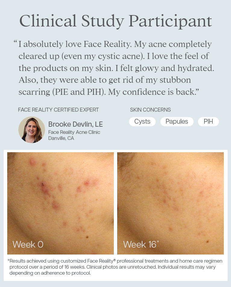 Ideally, yes. Our clinically proven Face Reality Clear Skin Method® shows the best results come from a combination of professional treatments, personalized home care, and lifestyle guidance. In-clinic treatments help clear active acne and address concerns that can follow breakouts, while consistent at-home care maintains your progress between visits. Best results are achieved by adhering to the regimen recommended by your Certified Acne Expert®.